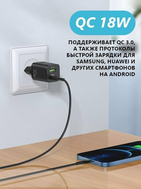 СохранитьБыстрая зарядка HOCO QC 3.0 для телефона, планшета, Android, Samsung, Xiaomi, Huawei, Honor / Зарядное устройство 30W + кабель Type-C - 8pin (Lightning) / Блок питания USB-Type-C интересное: