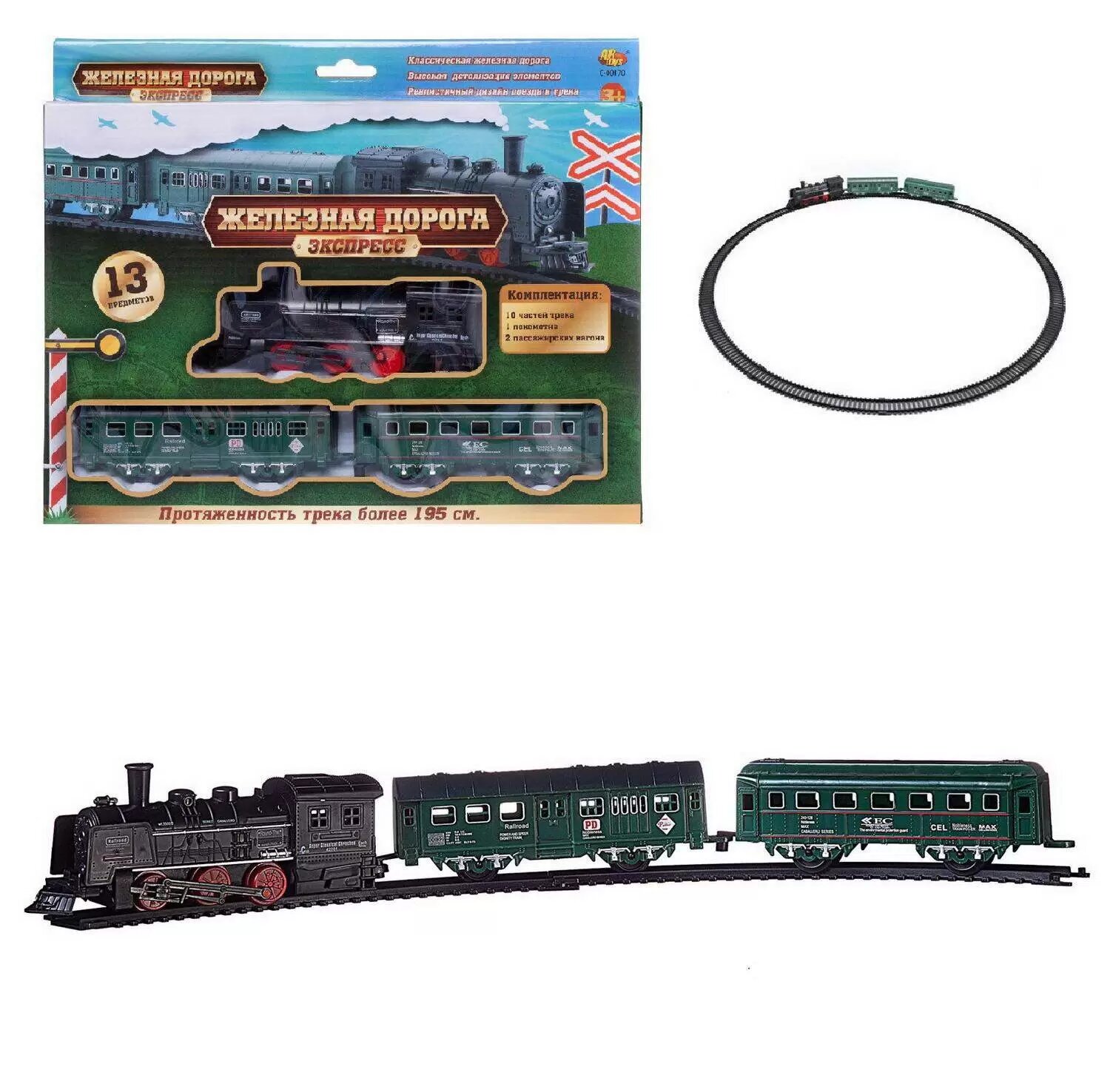 | Подробная комплектация | 10 частей трека, 1 локомотив, 2 пассажирских вагона |