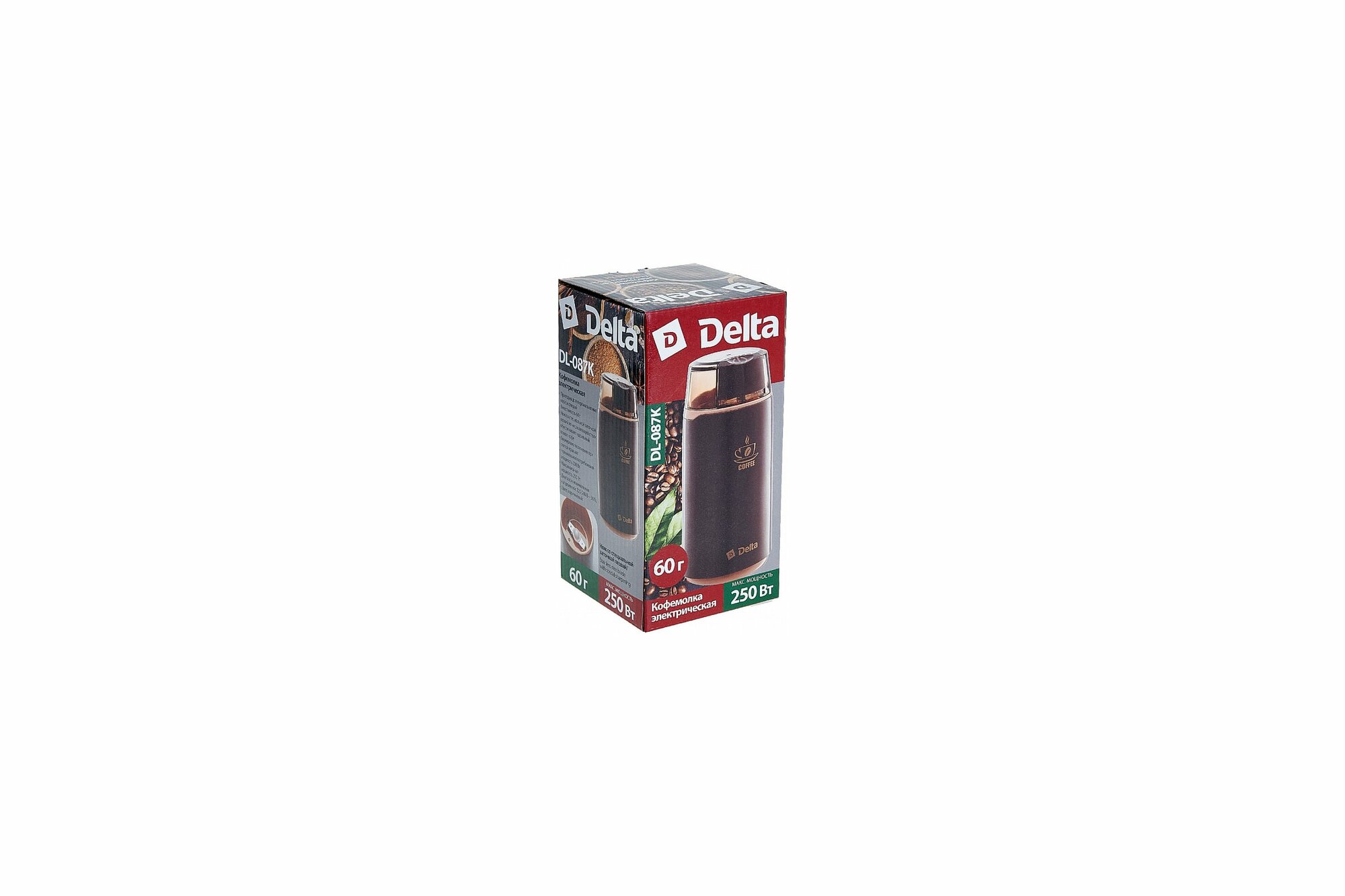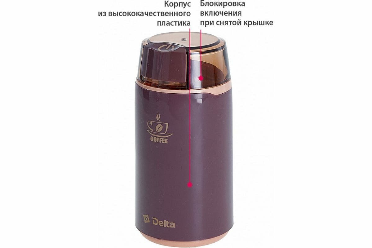 Кофемолка Delta DL-087K, ротационный нож из нержавеющей стали, мощность 250 Вт, блокировка крышки, 60г. кофе, коричневый (К)