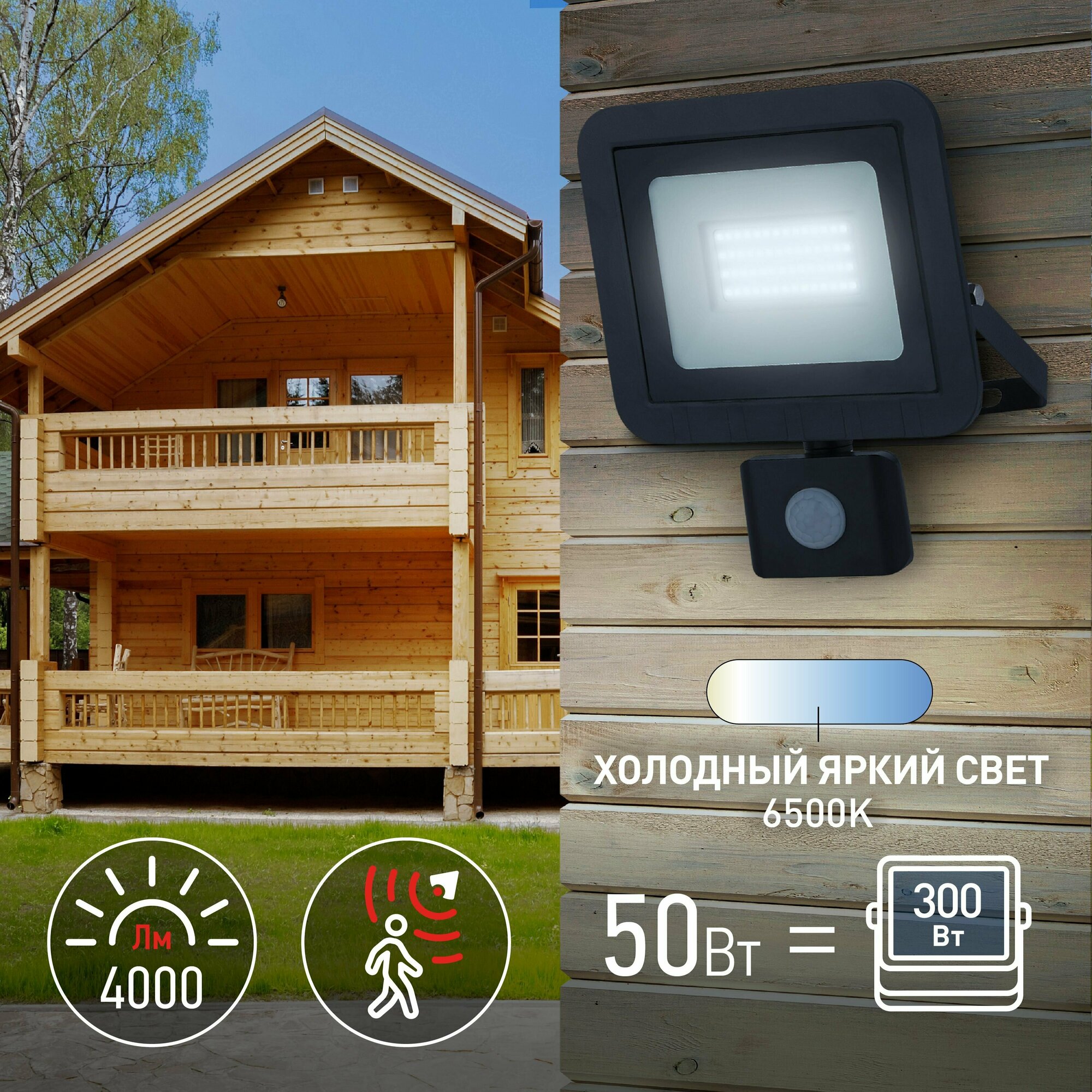 Прожектор светодиод СДО 50Вт 6500К 4000Лм черный с внешним датчиком движения IP65 LPR-041-2-65K-050 ЭРА
