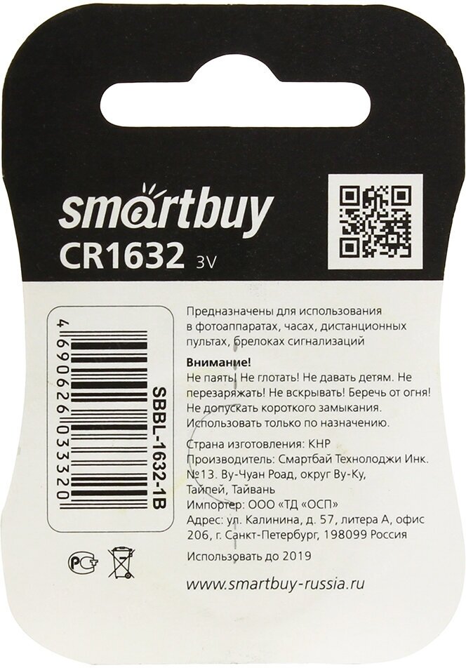 Литиевый элемент питания SMARTBUY (SBBL-1632-1B) CR1632/1B 1 шт.