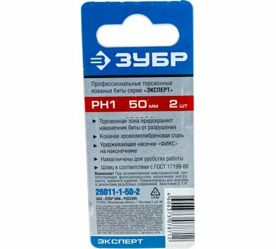 Зубр "эксперт" Биты торсионные кованые, обточенные, хромомолибденовая сталь, тип хвостовика E 1 4", PH1, 50мм, 2шт 26011-1-50-2
