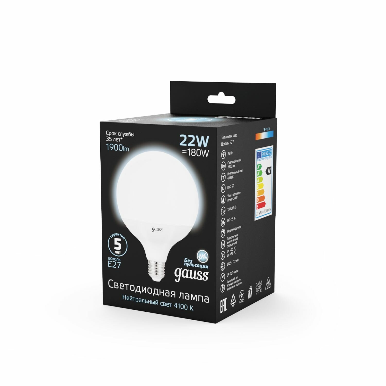 Купить Лампа светодиодная Black 22Вт G125 шар 4100К нейтр. бел. E27 1900лм GAUSS 105102222