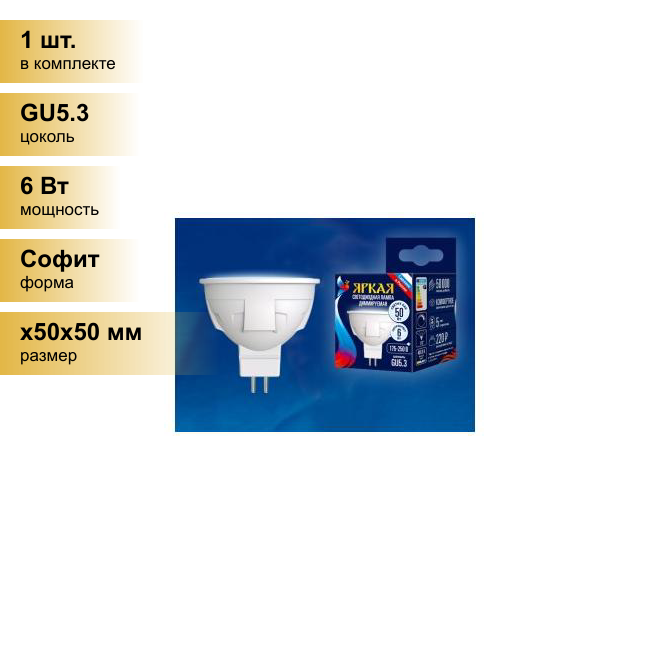 Лампа 10шт светодиодная диммируемая Uniel, яркая MR16 GU5.3 220V 6W(500lm 110°) 4000K, матовая 50x55 LED-JCDR 6W