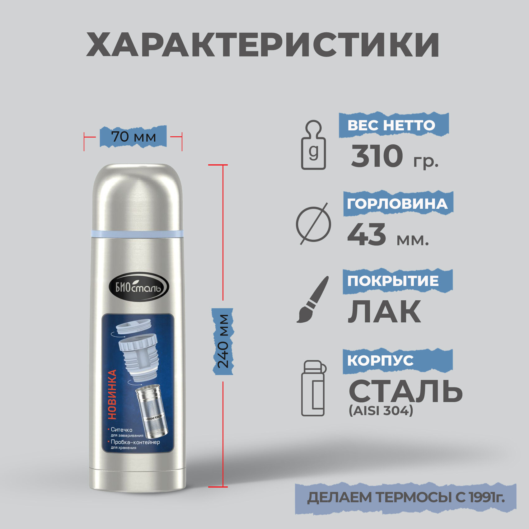 Термос Biostal (0,35 литра) пробка с ситечком, стальной