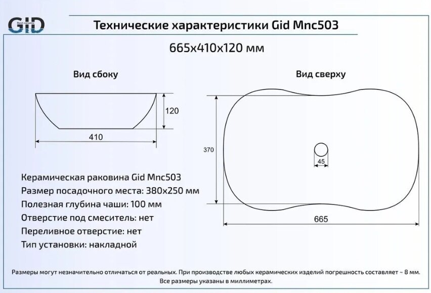 Накладная раковина для ванной Gid Mnc503 с донным клапаном