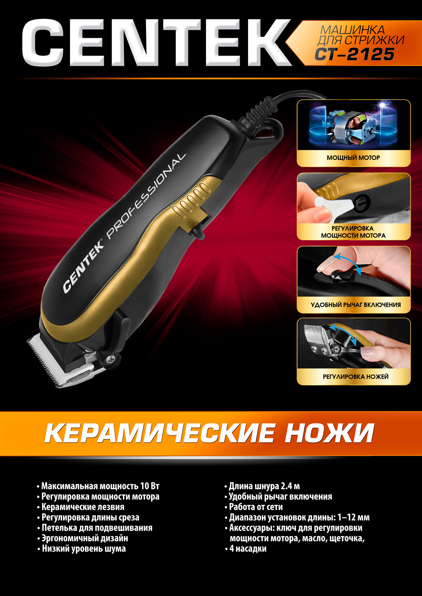 Профессиональная машинка для стрижки волос CENTEK CT-2125 - керамические ножи/ работа от сети/ шнур 2,4м