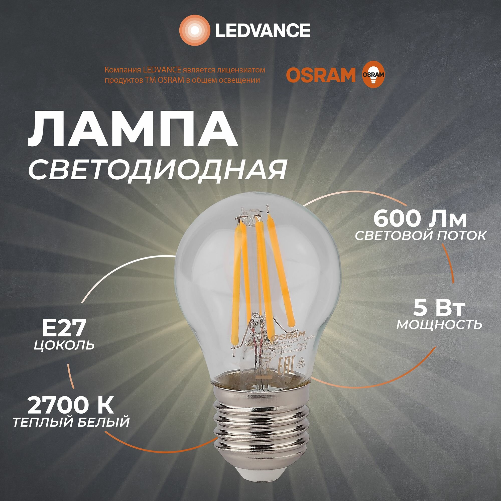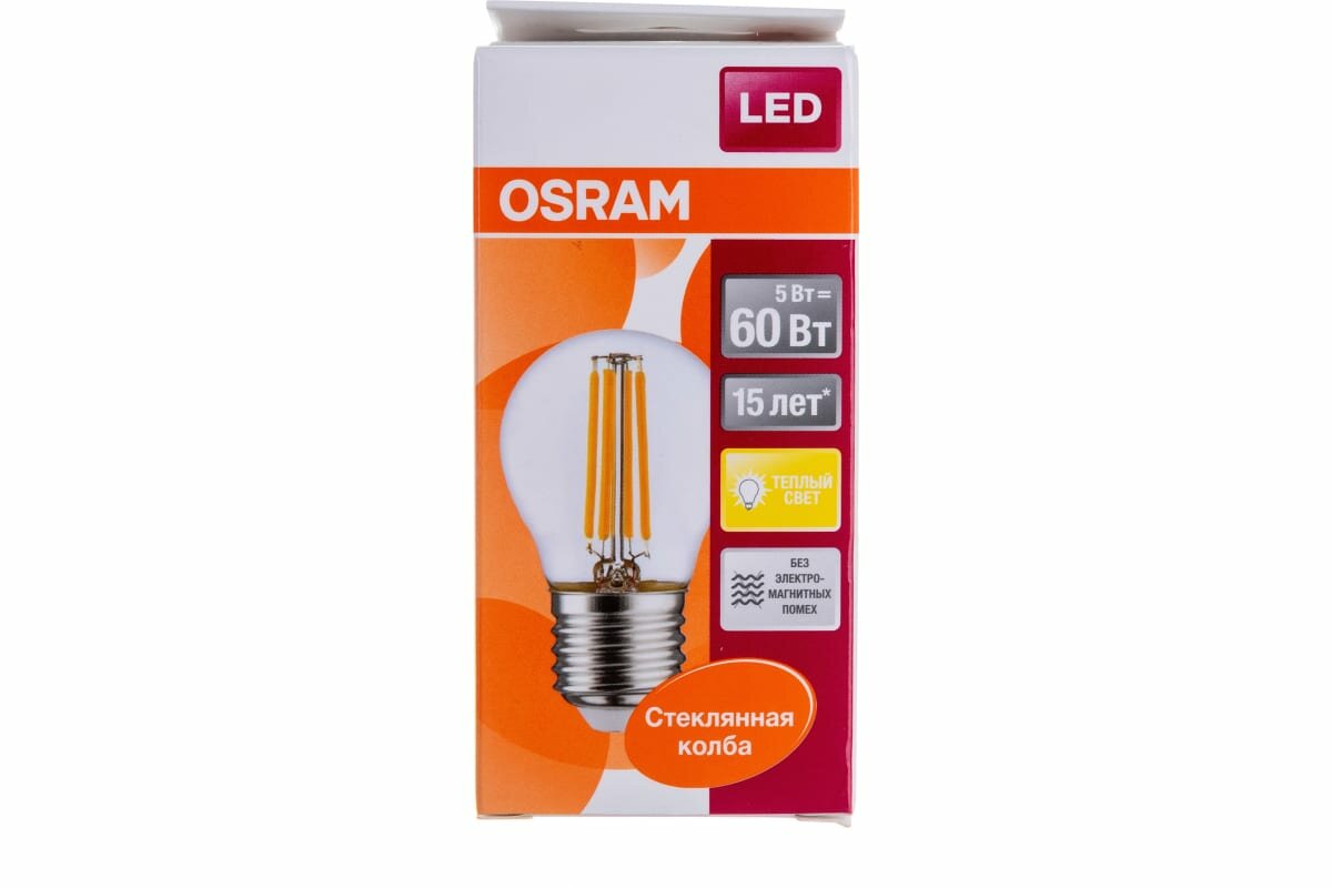 Купить Лампа OSRAM LED Star E27 шар P (G45) 5Вт, филаментная, светодиодная LED, 600 лм, эквивалент 60Вт, тёплый свет 2700К