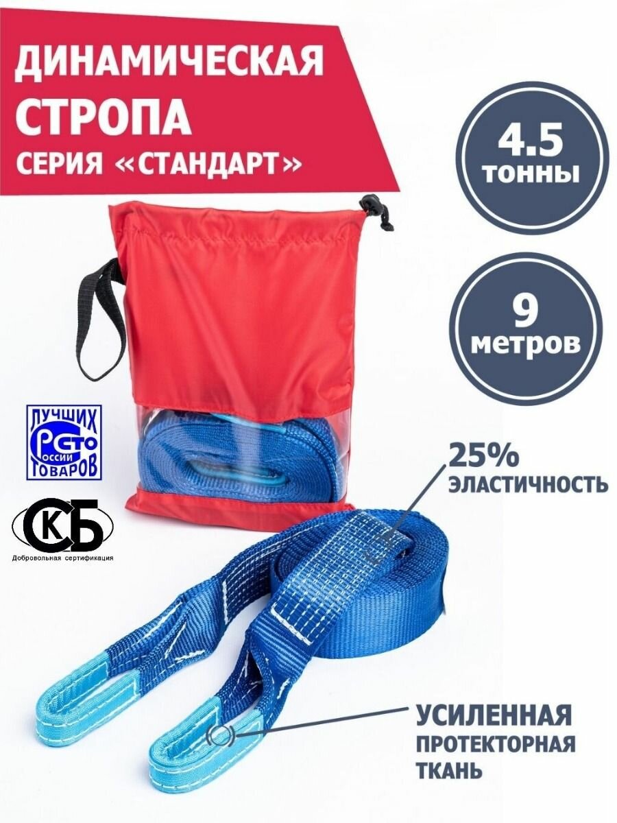 Динамическая стропа 9 т 9 м серия "Стандарт" + мешок, рывковый трос для автомобиля, Tplus