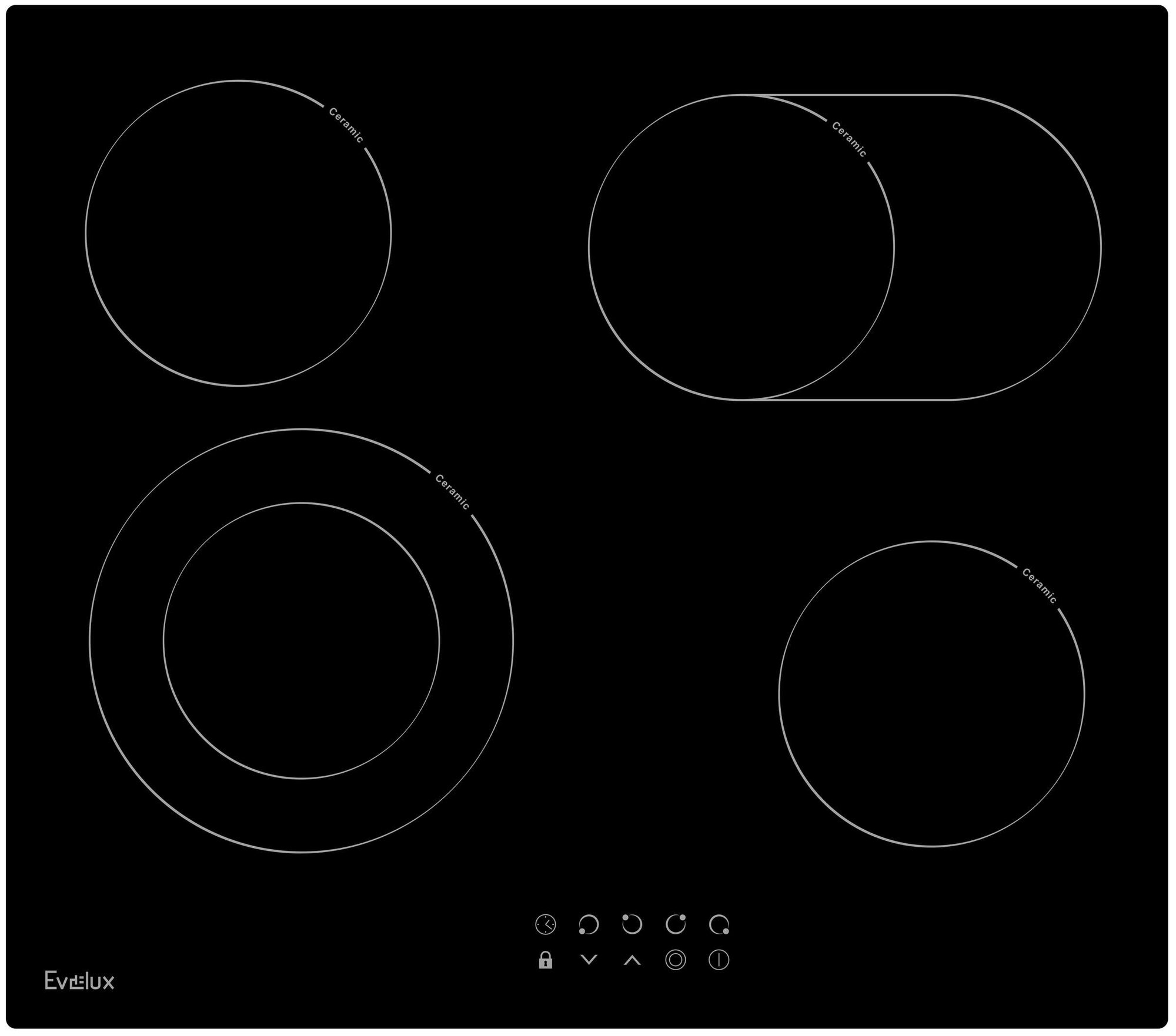 Варочная панель EVELUX электрическая, стеклокерамика, Hi Light, 60 см, 4 конфорки, сенсорное управление, 9 уровней мощности, таймер 1-99 мин, блокировка управления, защитное отключение, двухконтурная, овальная зона, 6600 Вт, черное стекло, 590х520х50 мм.