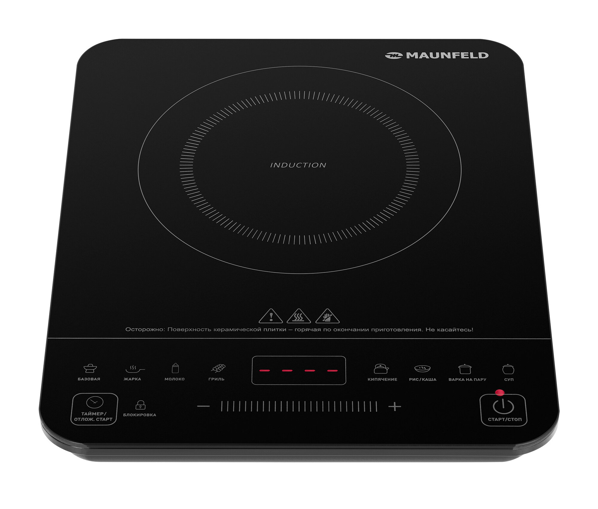 Нанесен круг позволяющий достаточно точно центрировать посуду - т.к. индукционный элемент имеет диаметр всего 15 см. (проверил на чугунной сковороде с дном наружный диаметр которого 22 см, масло кипело только в круге 15 см). Очень быстрое кипячение Очень удобное сенсорное управление : все режимы - это отдельные кнопки. |