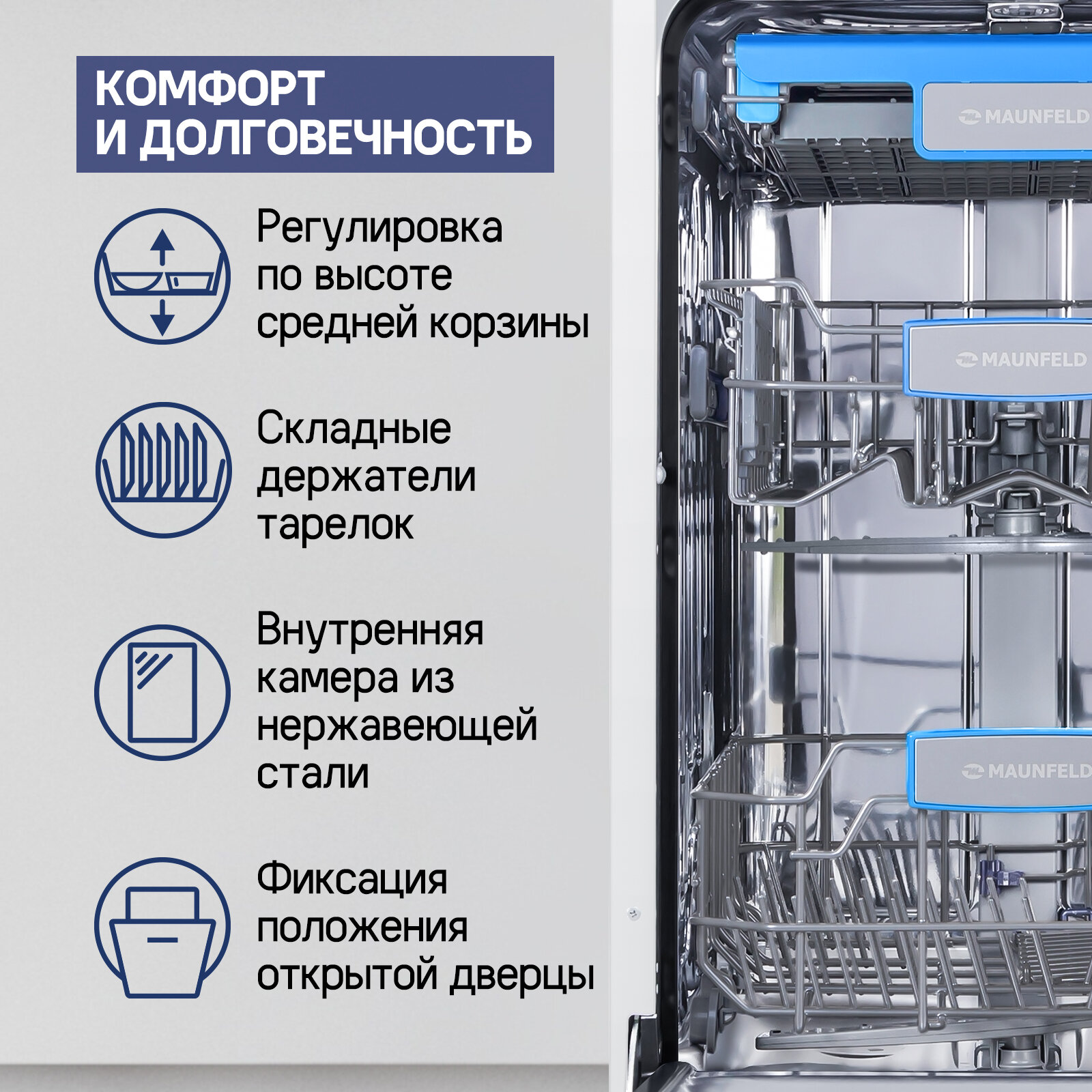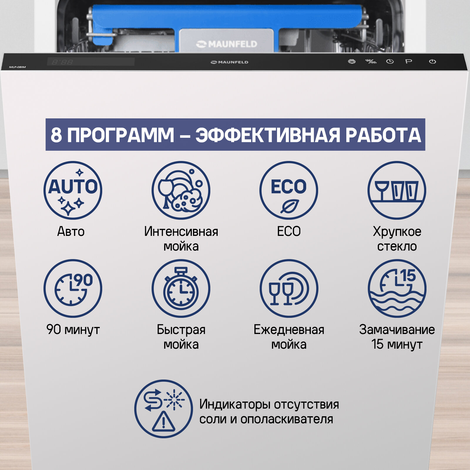 Посудомоечная машина MAUNFELD MLP-08IM встраиваемая, узкая 45 см, 10 комплектов, 8 программ, 3 корзины, луч на полу, турбосушка
