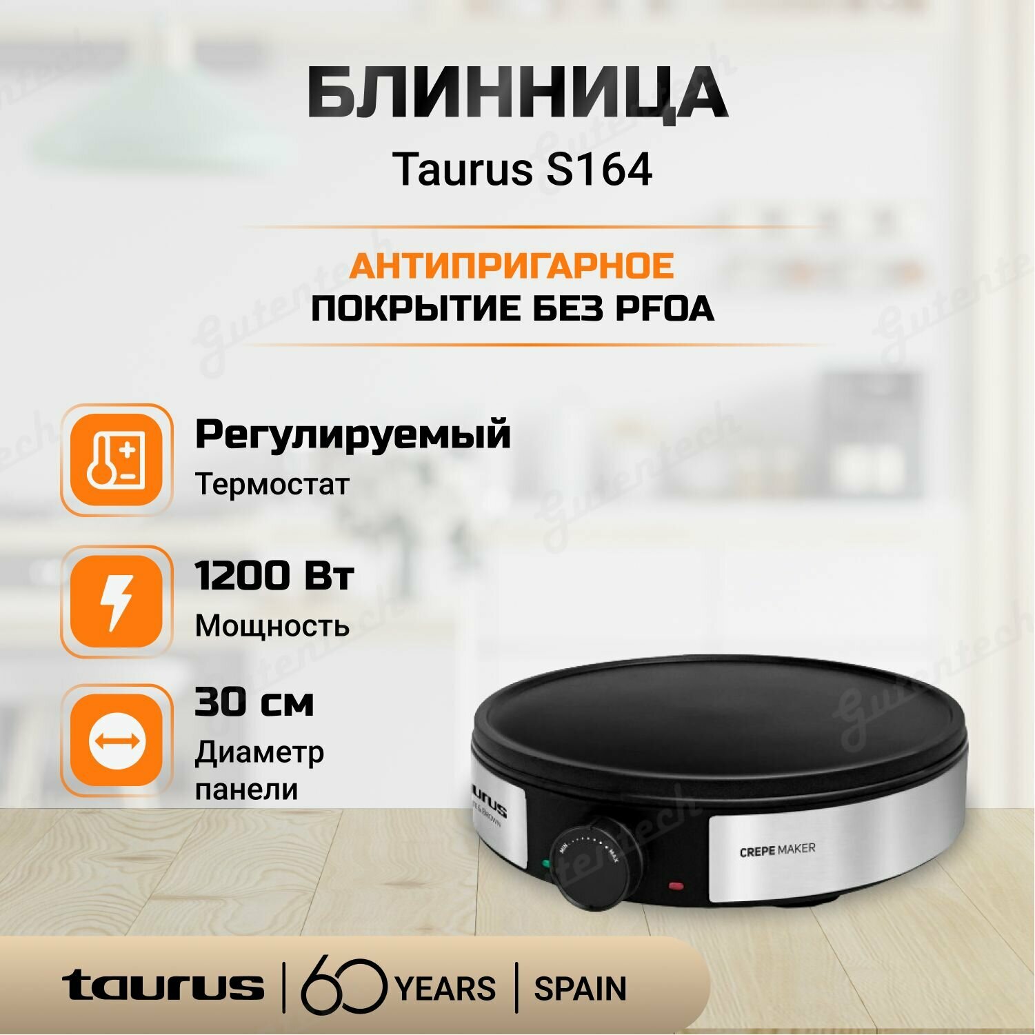Блинница Taurus S164 / мощность 1200 Вт / панель диаметром 30 см / стальной