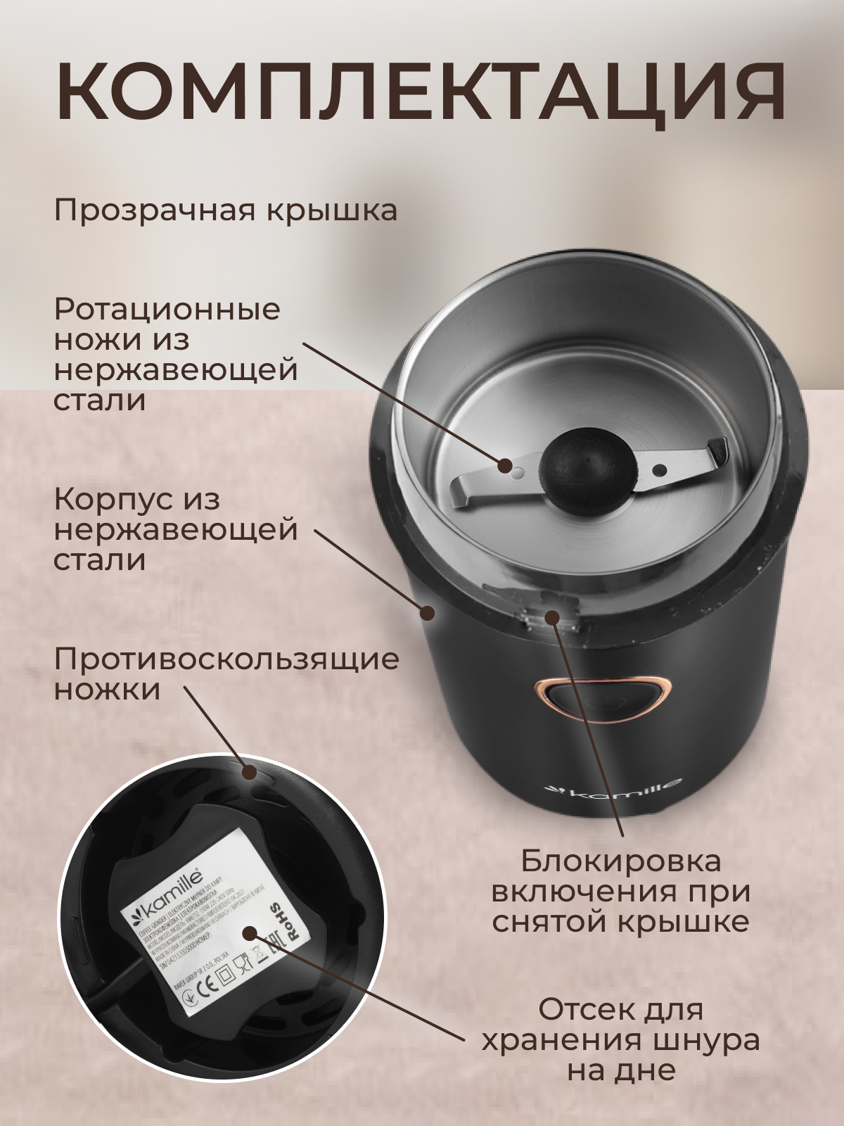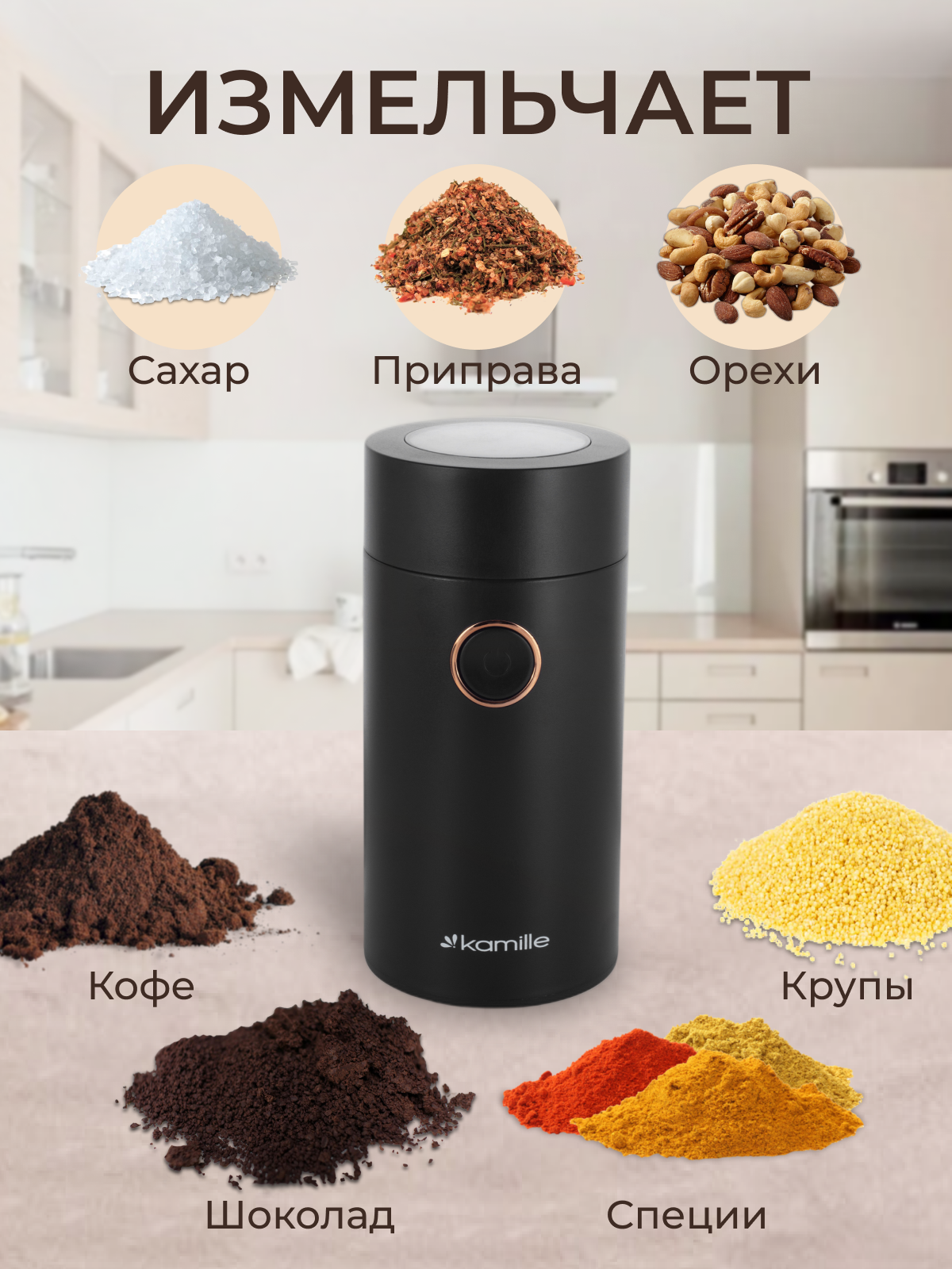 Кофемолка электрическая Kamille KM 6732 (6732 / черный) интересное: