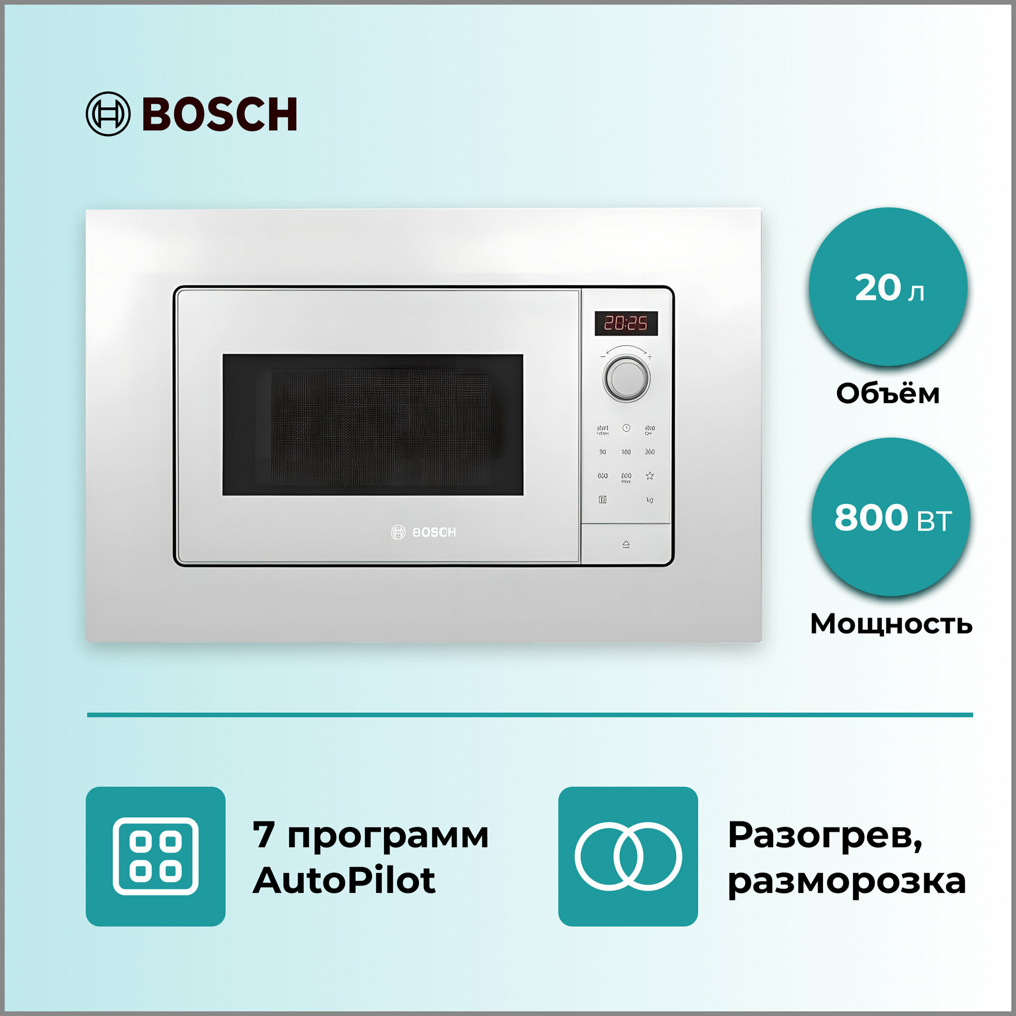 Встраиваемая микроволновая печь Bosch Serie 2, ,белый, микроволны до 800 Вт, 5 ступеней мощности микроволн, поворотный переключатель,многофу