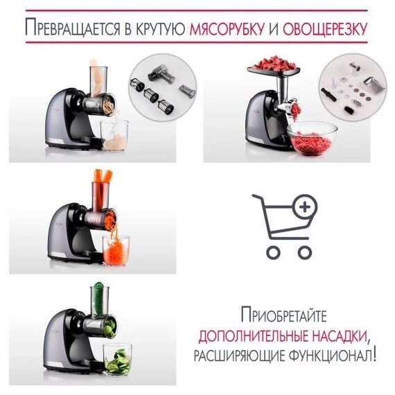 | Отзыв: | Из соковыжималки можно сделать мясорубку и овощерезку ,если купить насадки ,очень полезно для маленькой кухни |