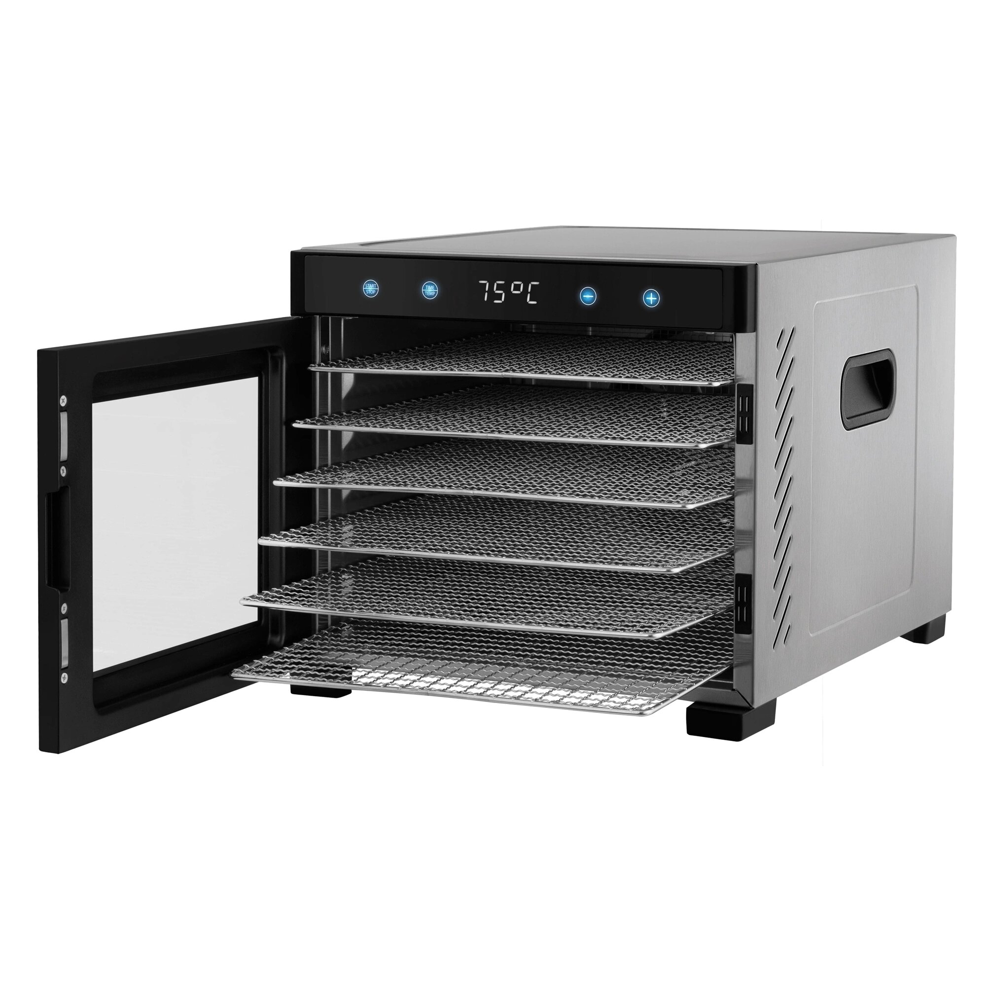 + Металлический корпус. + выемки-ручки для переноски + Стеклянная передняя дверца на магнитах + бесшумность работы + электронное управление сенсорными кнопками + металлические решетки и дополнительные пластиковый противень и сетка. |