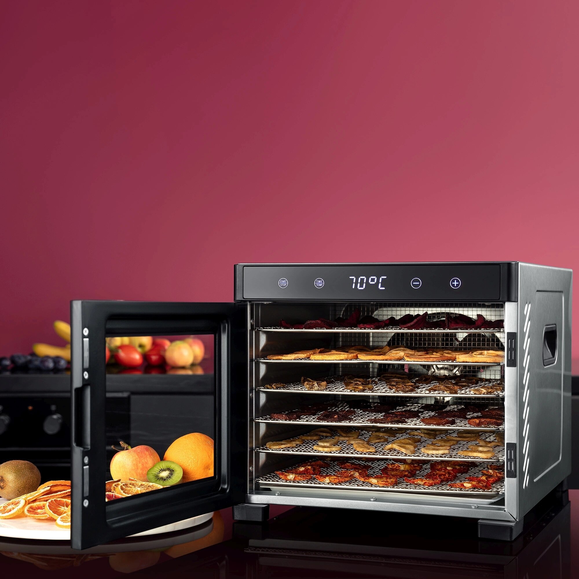 | Плюсы: | Купили эту сушилку недавно, ещё тестируем весь её функционал, но пока очень довольны приобретением. Насушили кучу яблок с дачи – сушка происходит равномерно, если более или менее одинаково нарезать яблоки. Делали банановые чипсы – получились гораздо вкуснее покупных. Вяленные томаты в масле – вообще супер. Делали пару раз йогурт, реально получился настоящий йогурт, с вареньем было очень вкусно. На очереди – фруктовая пастила и вяленное мясо. Решетки сделаны из металла, и в отличие от пластиковых, их хоть можно нормально промыть, не боясь сломать. После сушки бананов это было особенно актуально. По бокам сушилки есть специальные ручки для её переноски. Ну и внешне она очень эффектно смотрится |