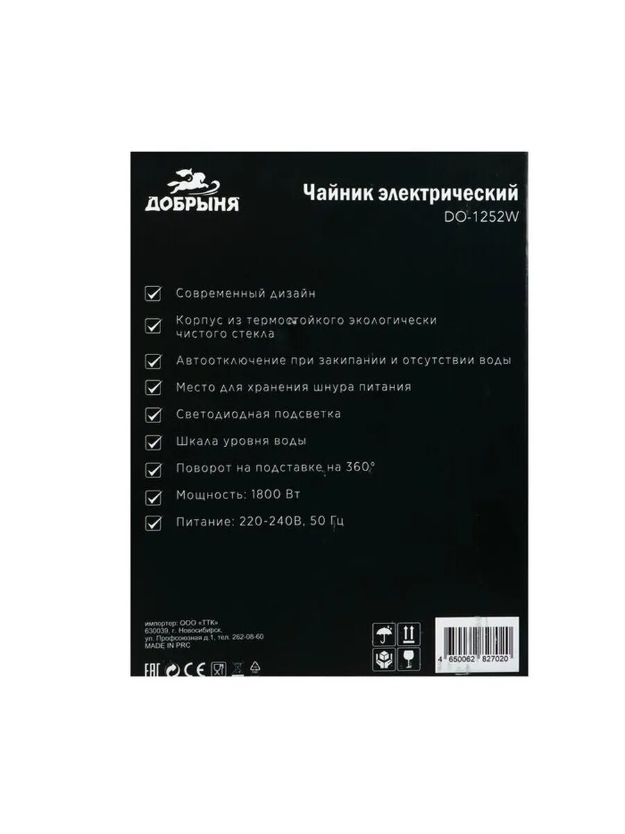 Чайник Добрыня Do-1252w белый 1,8л, 1,8кВт .