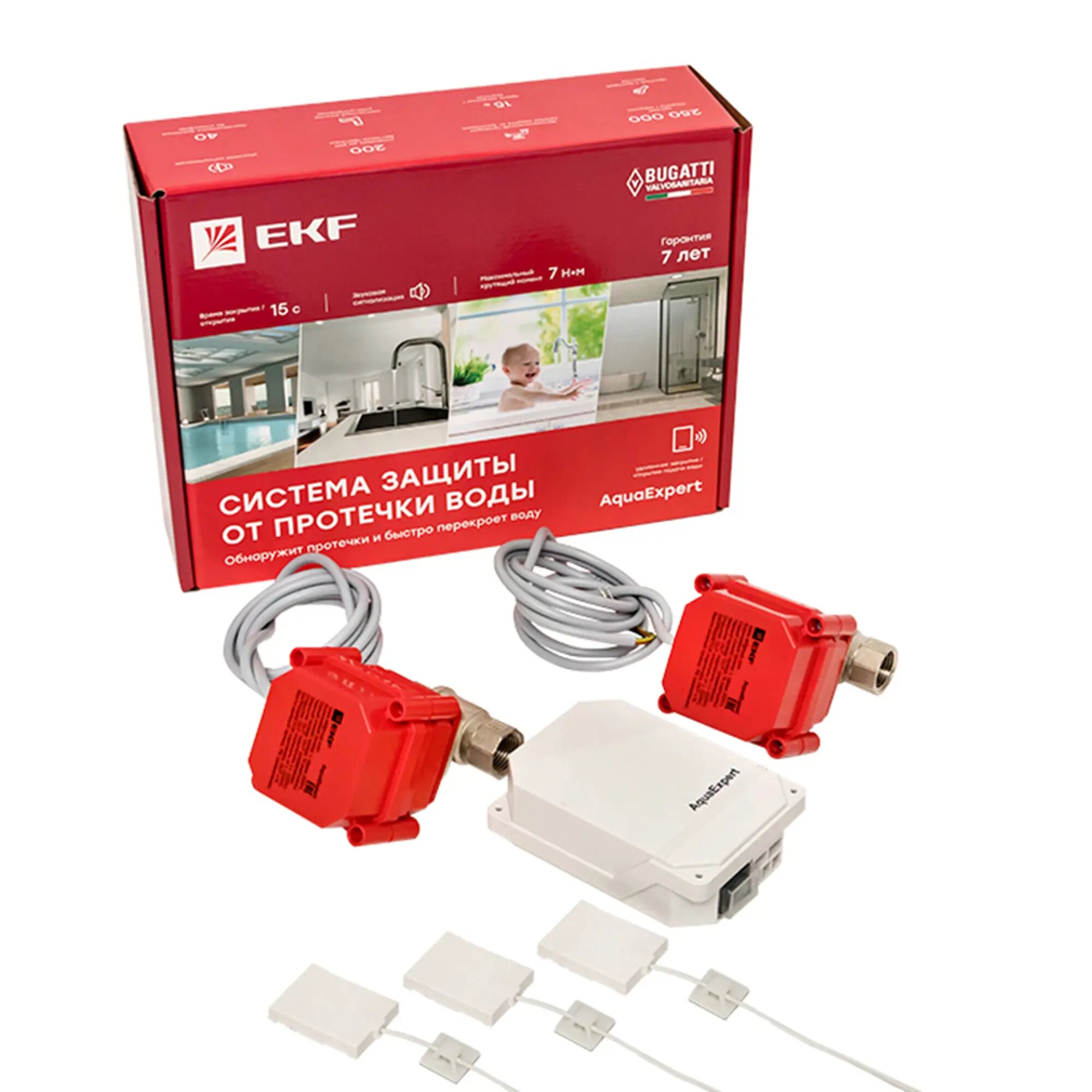 Система защиты от протечки воды AquaExpert 1/2 дюйма EKF [Шаровой кран с электроприводом – 2 шт, Модуль управления – 1 шт, Датчик протечки воды – 3