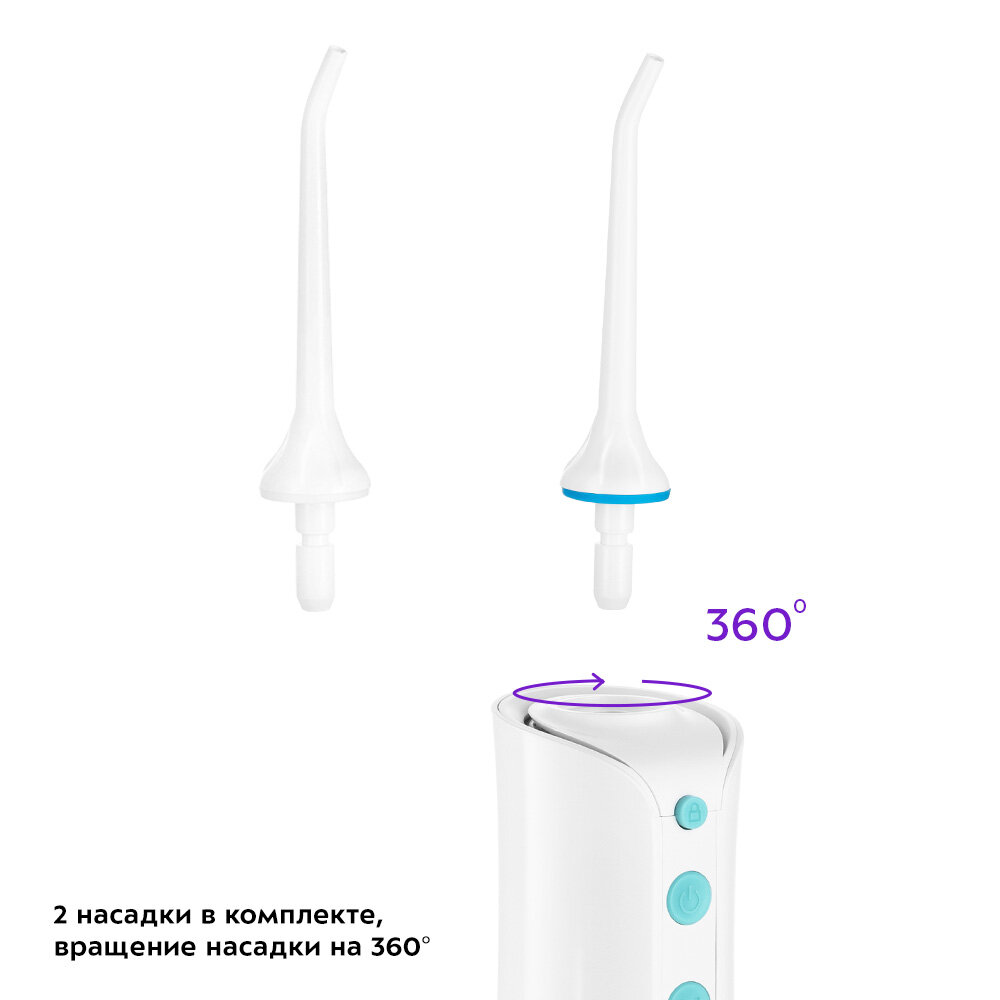 | Подробная комплектация | Комплектация 1. Ирригатор –– 1 шт. 2. Резервуар для воды –– 1 шт. 3. База для зарядки –– 1 шт. 4. USB-шнур – 1 шт. 5. Струйная насадка –– 2 шт. 6. Руководство по эксплуатации — 1 шт. 7. Коллекционный магнит — 1 шт.* *опционально |