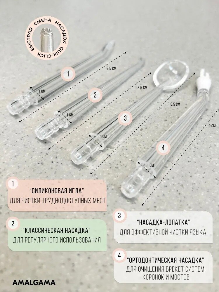 | Насадки | для струйной чистки / для чистки имплантов и коронок / для чистки языка / ортодонтическая (для брекетов) |