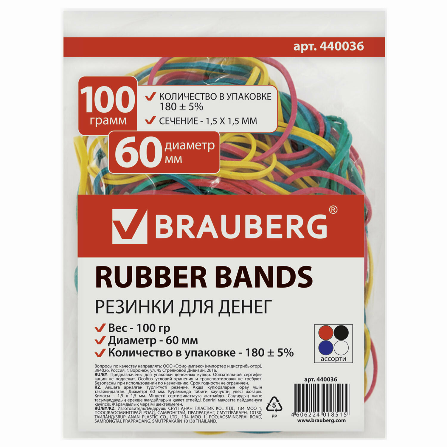 Резинки банковские универсальные диаметром 60 мм, BRAUBERG 100 г, цветные, натуральный каучук, 440036 (цена за 1 ед.товара)