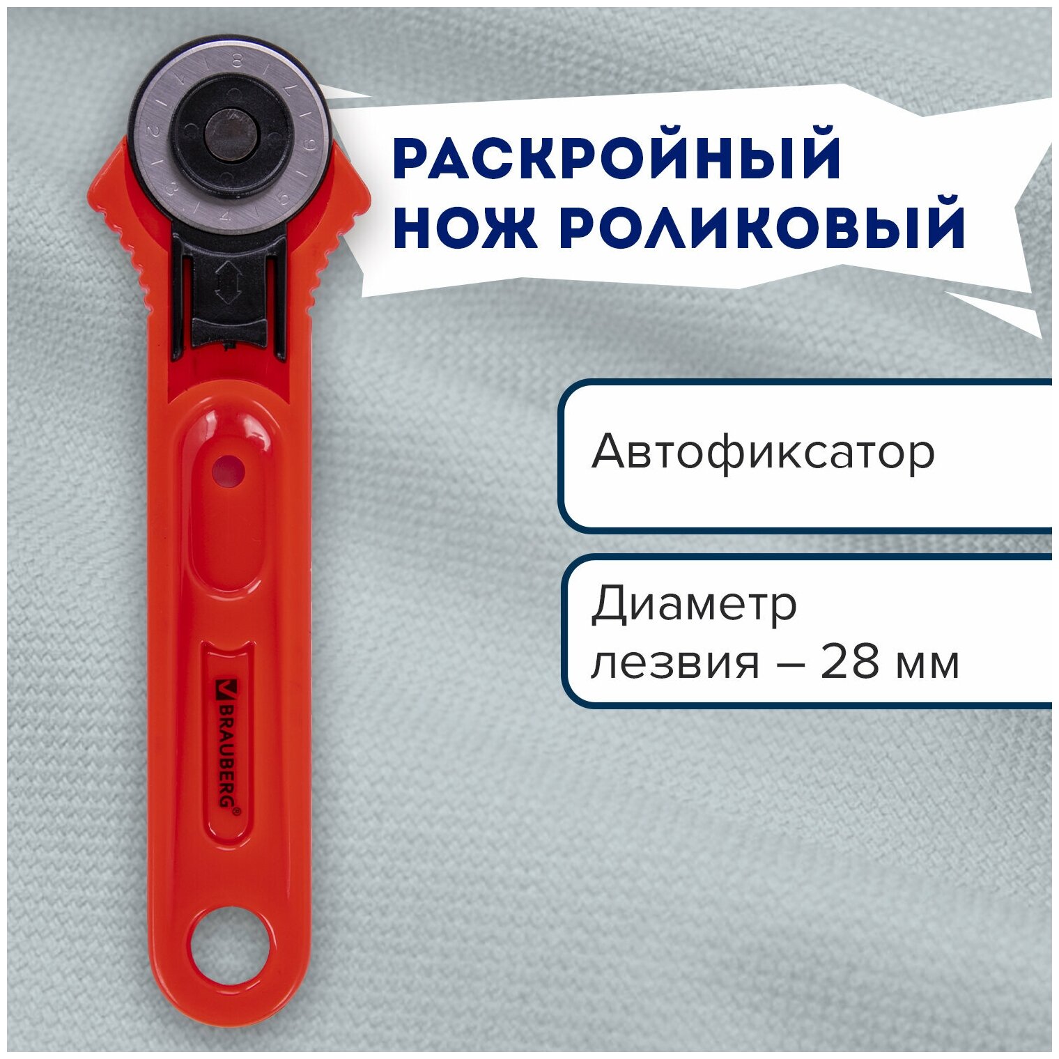 Нож раскройный роликовый канцелярский для рукоделия, досуга, творчества и шитья 28 мм Brauberg, круглое лезвие, 238090