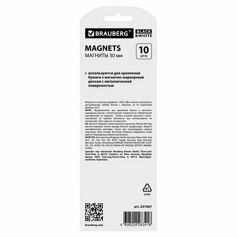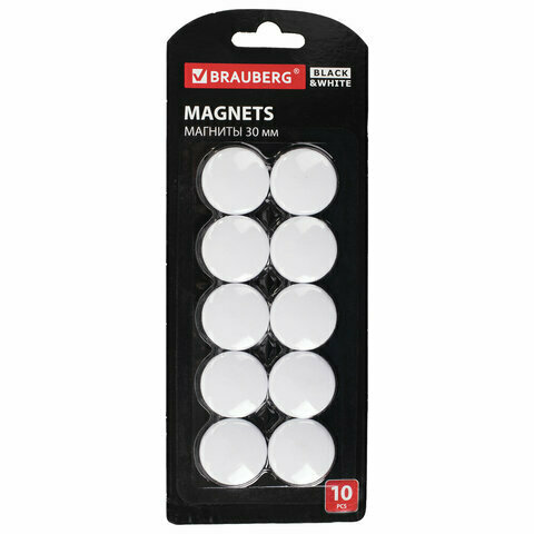 Магниты BRAUBERG "BLACK&WHITE" усиленные 30 мм, набор 10 шт., белые, 237467 В комплекте: 1шт.