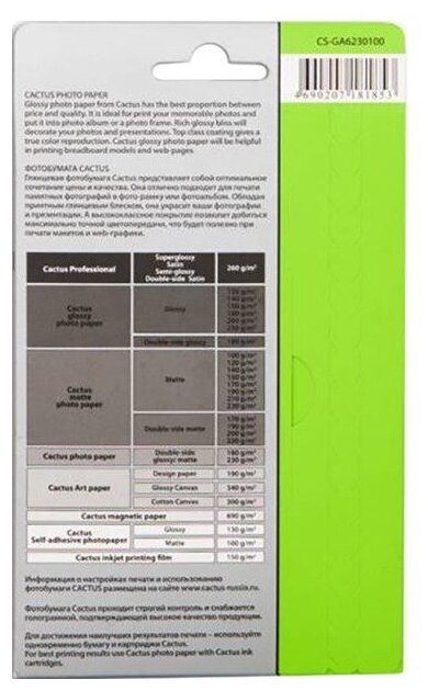 Бумага 10X15CM PHOTO GLOSSY 100SH CS-GA6230100 CACTUS