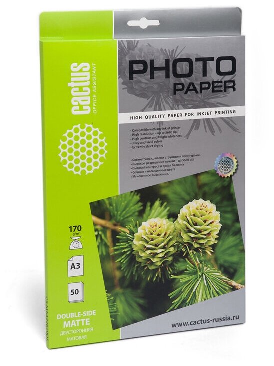 Фотобумага для струйной печати А3, 50 листов Cactus, 170 г/м2, двусторонняя, матовая