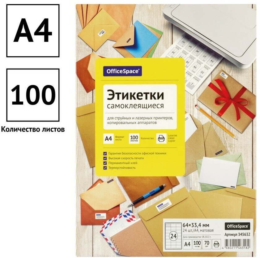 Этикетки самоклеящиеся А4 100л. OfficeSpace, белые, 24 фр. (64*33,4), 70г/м2 (арт. 260681)