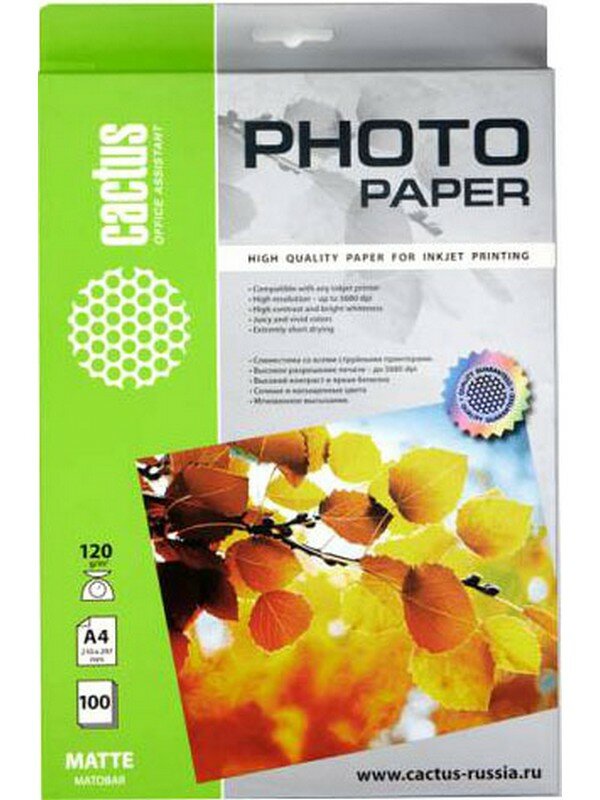 Фотобумага Cactus CS-MA4120100, A4, 120г/м2, 100л, для струйной печати, белый, покрытие матовое