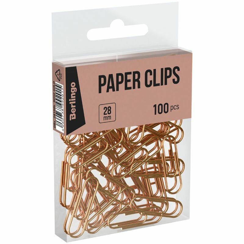 Скрепки 28мм, Berlingo, 100шт, цветные, ПВХ упак., европодвес, розовое золото (арт. 330192)