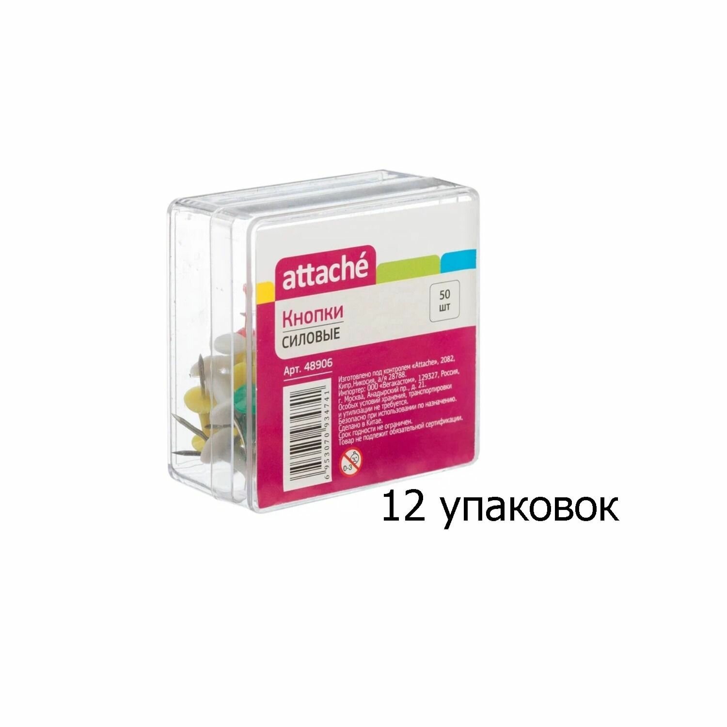 Кнопки силовые д/пробковых досок ATTACHE,пластиковая шляпка,ассорти,50шт/уп. 48906