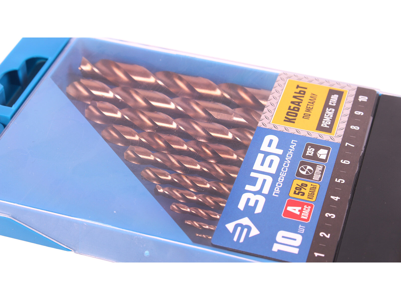 Набор сверл по металлу 10 шт (d=1-10 мм), кобальт, сталь Р6М5К5, класс А, ЗУБР Профессионал 29626-H10