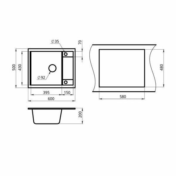 Кухонная мойка кварцевая Granula GR-6002 односекционная квадратная с крылом, врезная, чаша 395x430, цвет черный (6002bl)