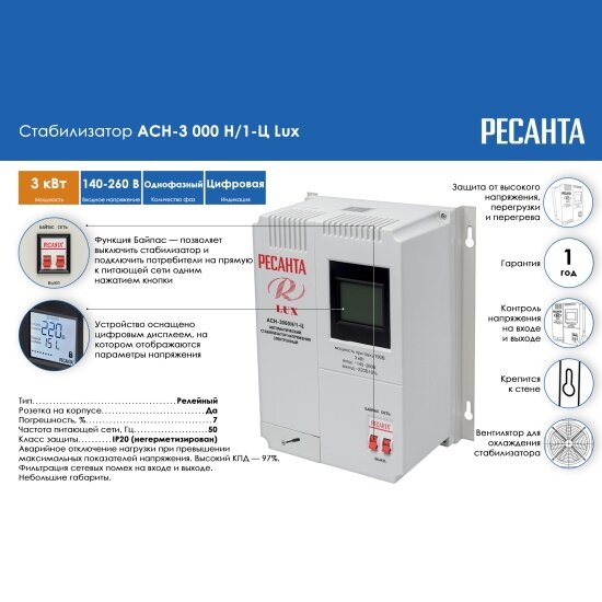 Стабилизатор напряжения однофазный LUX РЕСАНТА АСН-3000Н/1-Ц, 3 кВт, настенный