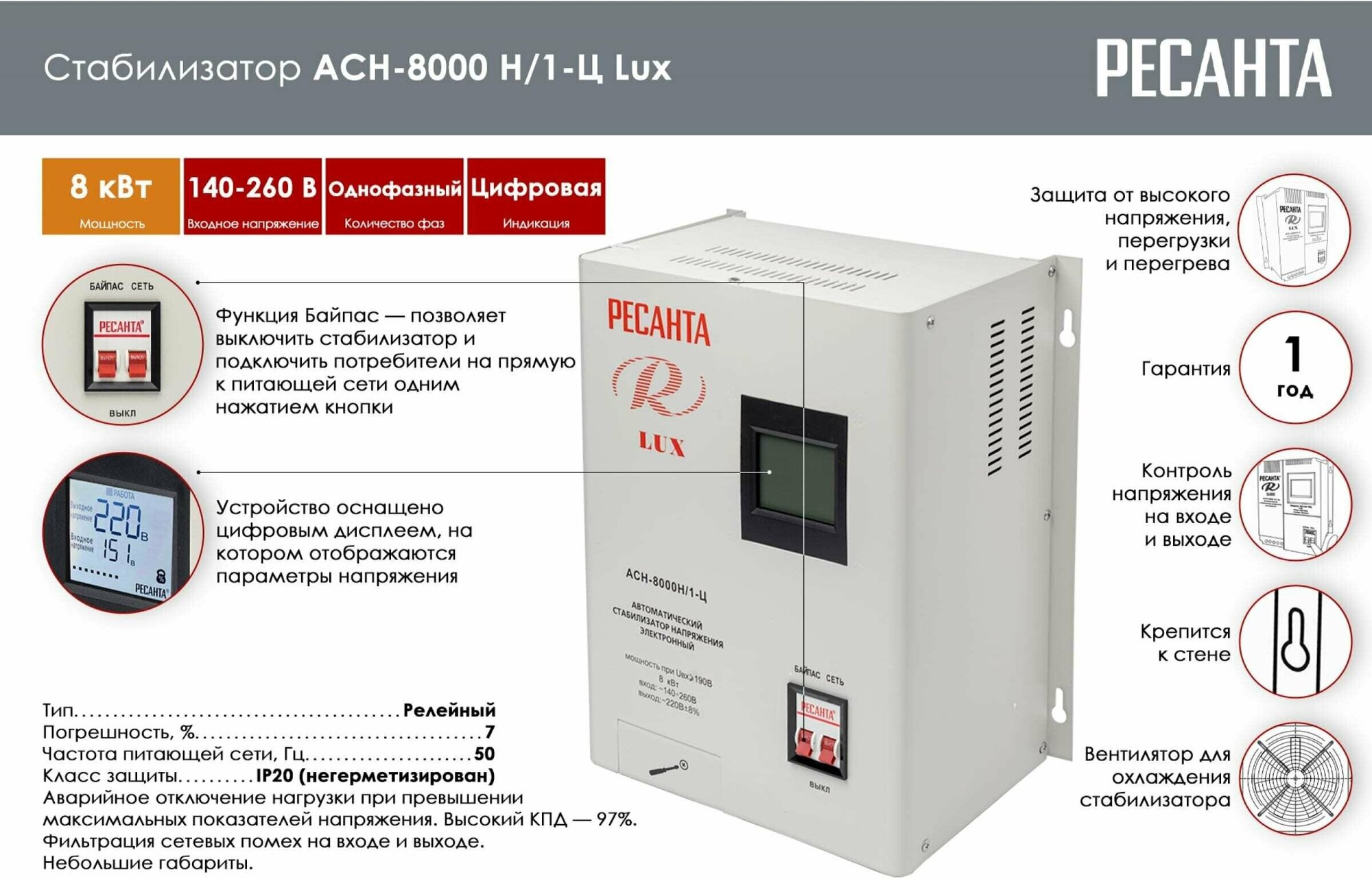 Однофазный цифровой настенный стабилизатор напряжения РЕСАНТА ACH-3000Н/1-Ц