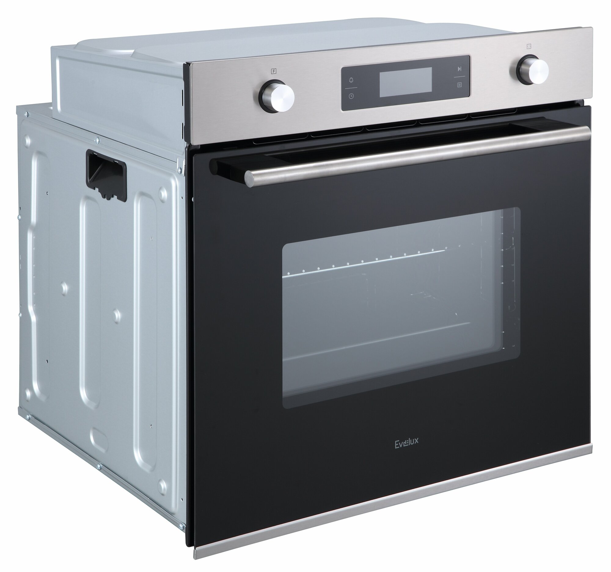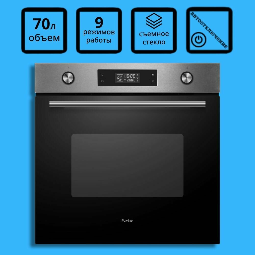 Электрический духовой шкаф Evelux EO 650 PX, 9 режимов работы: верхний + нижний нагрев, гриль, конвекция, система автоматического охлаждения, традиционная очистка, объем 70 л