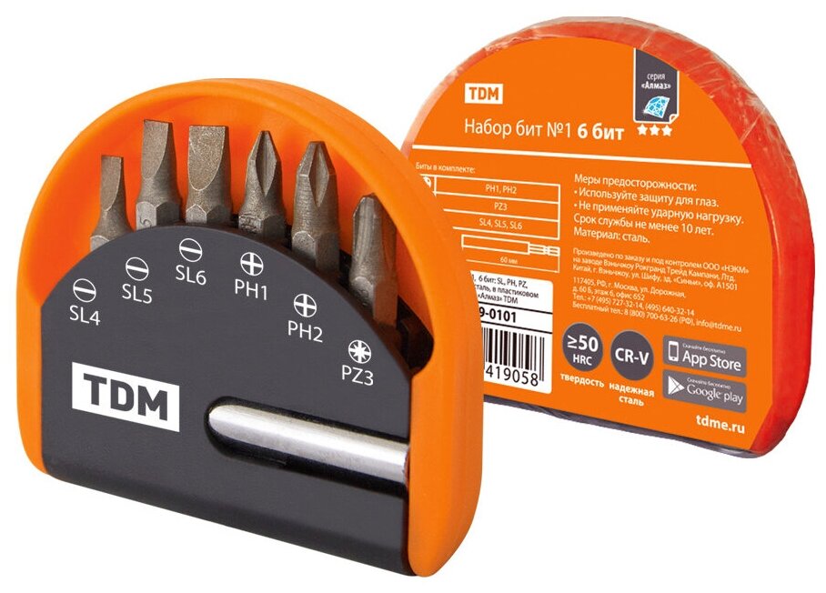 Набор бит TDM №1, 6 бит: SL, PH, PZ, удлин-ль CR-V сталь, в пласт. держат., «Алмаз»
