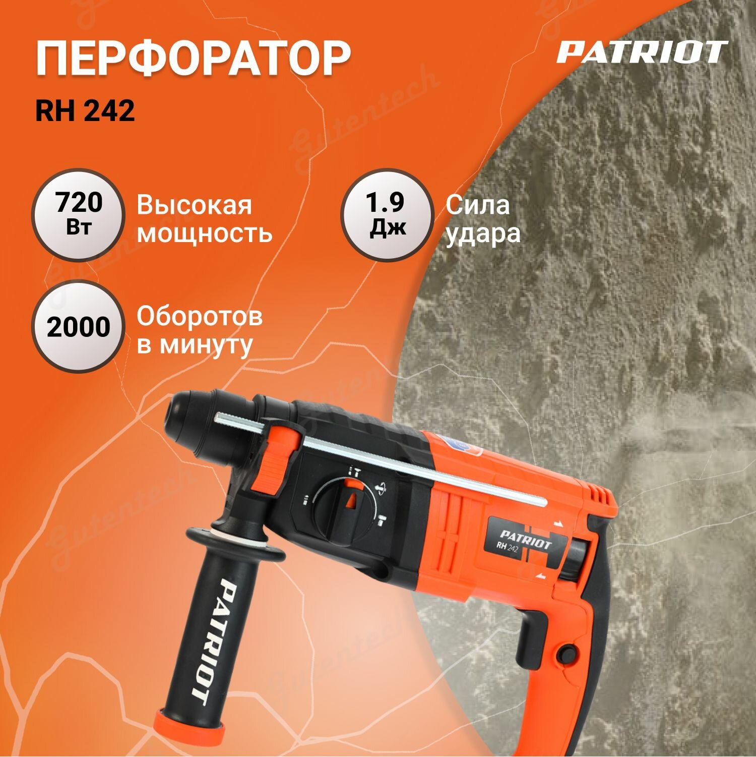 Перфоратор PATRIOT RH 242, SDS+, 1.9Дж, 720Вт, 0-2000об/мин, 0-6300уд/мин