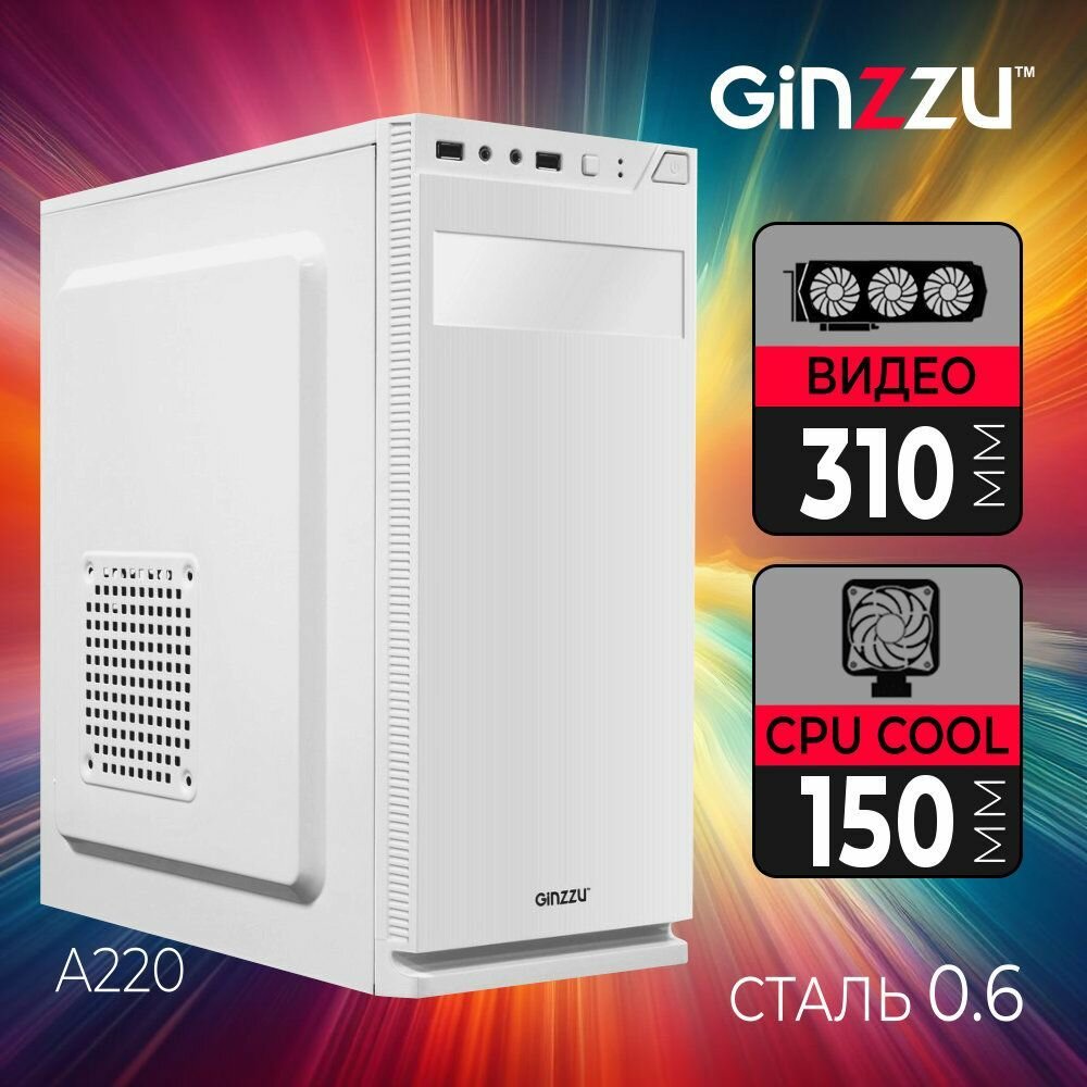 Корпус Ginzzu A220, Midi Tower, без БП, 2xUSB 2.0, AU, белый