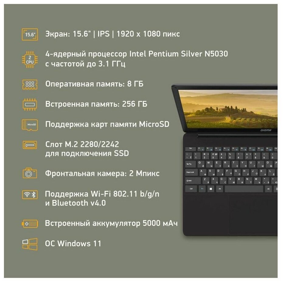 15.6" Ноутбук DIGMA Eve 15P417 1920x1080, Intel Celeron N4000 1.1 ГГц, RAM 8 ГБ, DDR3L, SSD 256 ГБ, Intel UHD Graphics 605, Windows 11 Home