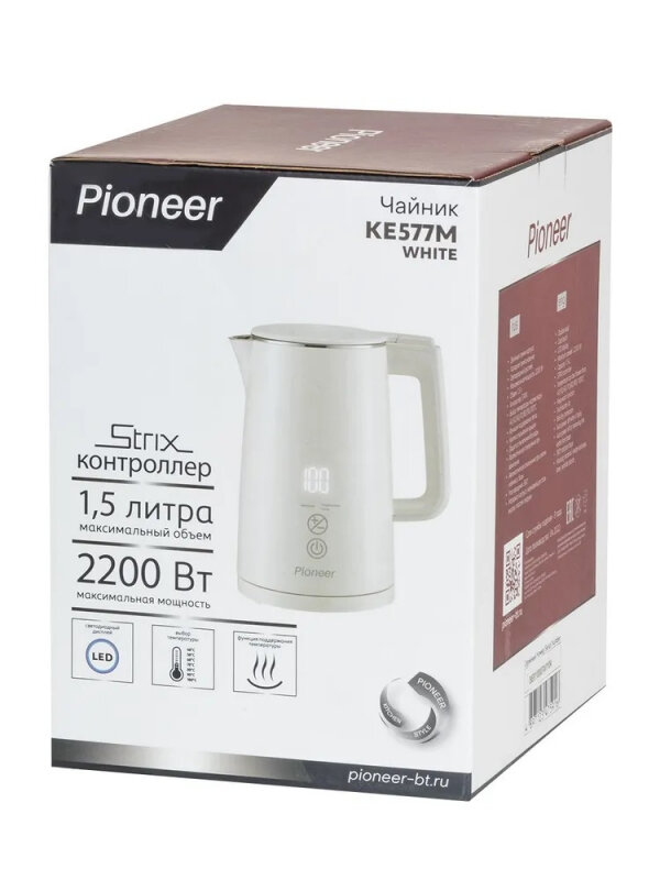 Электрический чайник Pioneer с LED дисплеем, 1,5 л, выбор температуры 40/50/60/70/80/90/100 градусов, поддержание тепла, контроллер STRIX, 2000 Вт