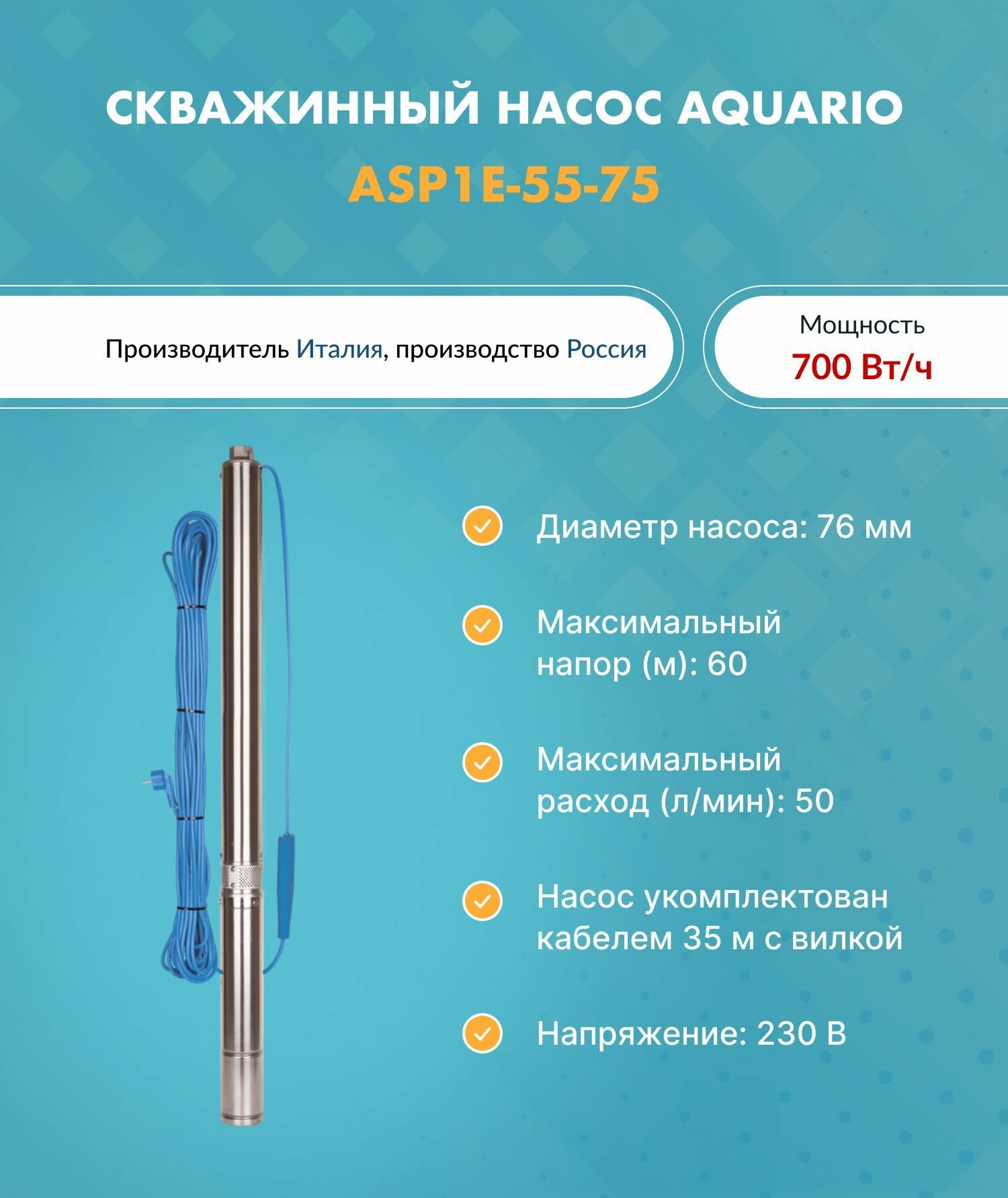 Насос скважинный Aquario ASP 1E-55-75 (Акварио) с кабелем 35 м