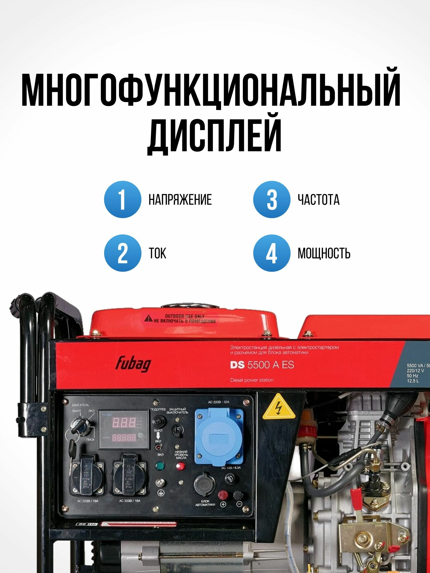 | Функции | защита от перегрузок / вольтметр / счётчик моточасов / выход 12 В |