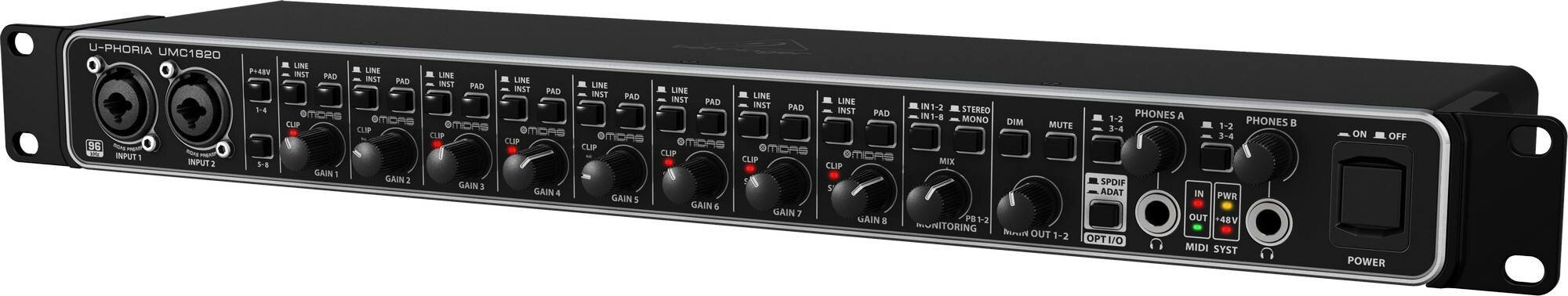 Behringer UMC1820 внешний звуковой/MIDI интерфейс, USB 2.0 ,18 вх/20 вых канала, 24бит/96кГц, предусилители MIDAS, MIDI I/O, ADAT I/O, S/PDIF I/O