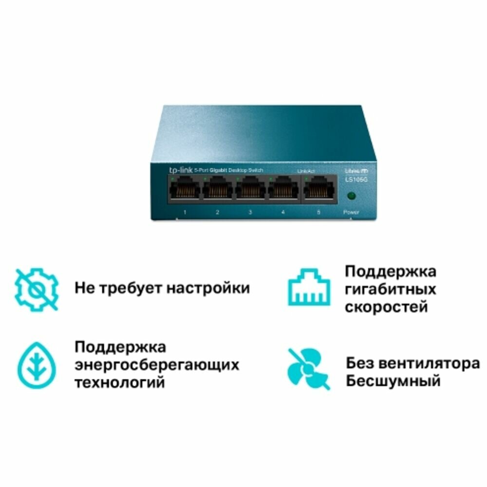 Неуправый коммутатор TP-Link LS105G 5 портов RJ45 10/100/1000 Мбит/с, металлический корпус, настольный/монтируемый на стену, plug and play