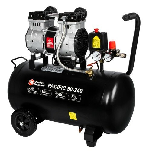 Компрессор поршневой безмасляный QUATTRO ELEMENTI PACIFIC-50 (240 л/мин, 50л, 1,2л.с, 8 бар, 30кг, малошумный)